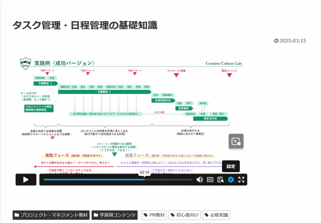 たとえば、プロジェクトを行うにあたっては絶対に必要になる日程管理やタスク管理についての動画教材の様子を、下(↓)の画像で紹介します。